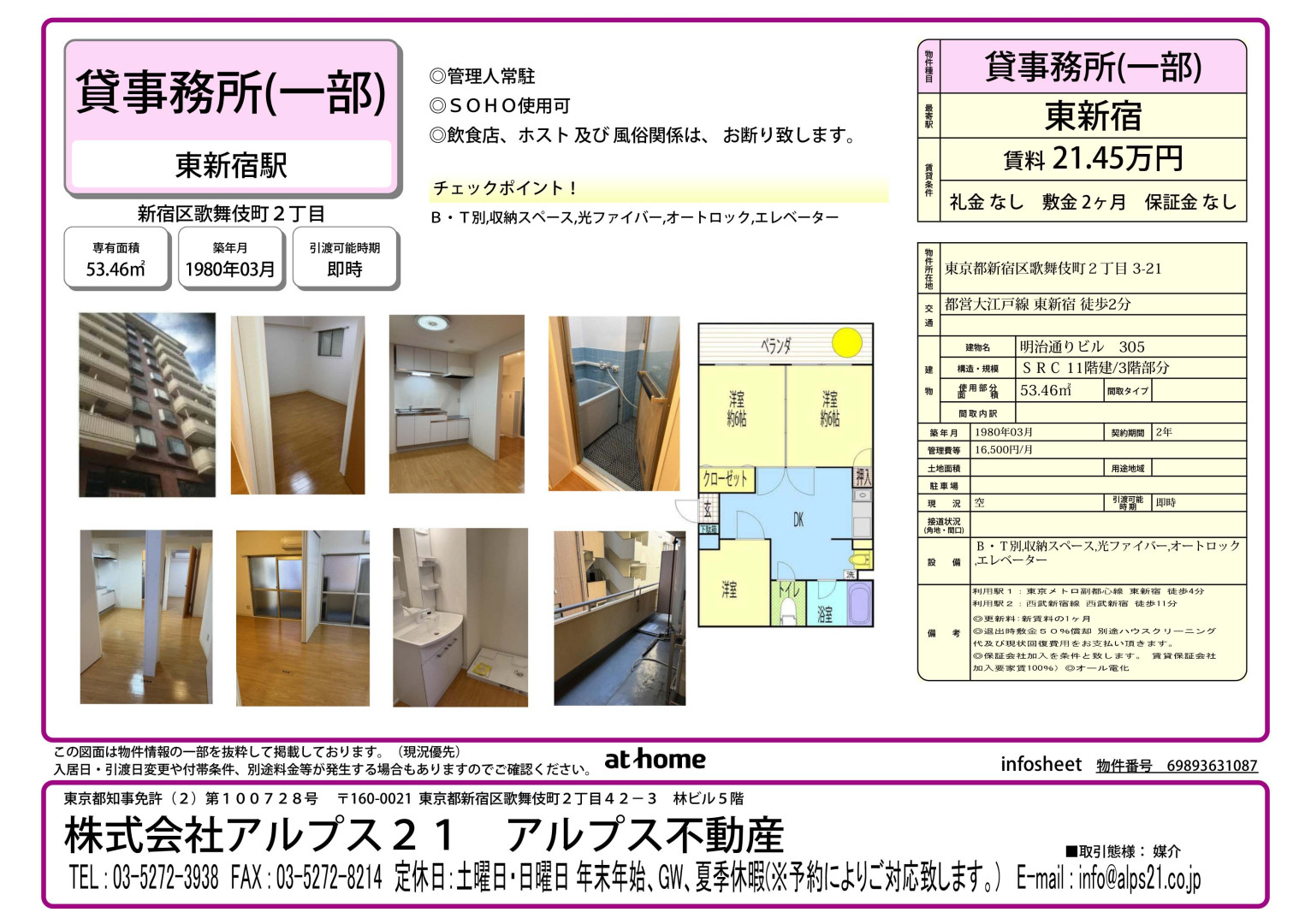 明治通りビル 305new 21.45万円 53.46m² 物件の詳細を見る 賃料 21.45万円 事務所 共益費・管理費16500円 敷金2ヶ月 所在地 東京都新宿区 歌舞伎町2丁⽬ 3-21 交通 都営大江戸線東新宿駅 徒歩2分 東京メトロ副都心線東新宿駅 徒歩4分 築年月 1980/03 構造SRC 面積 53.46m² 階数 地上 11階 物件番号