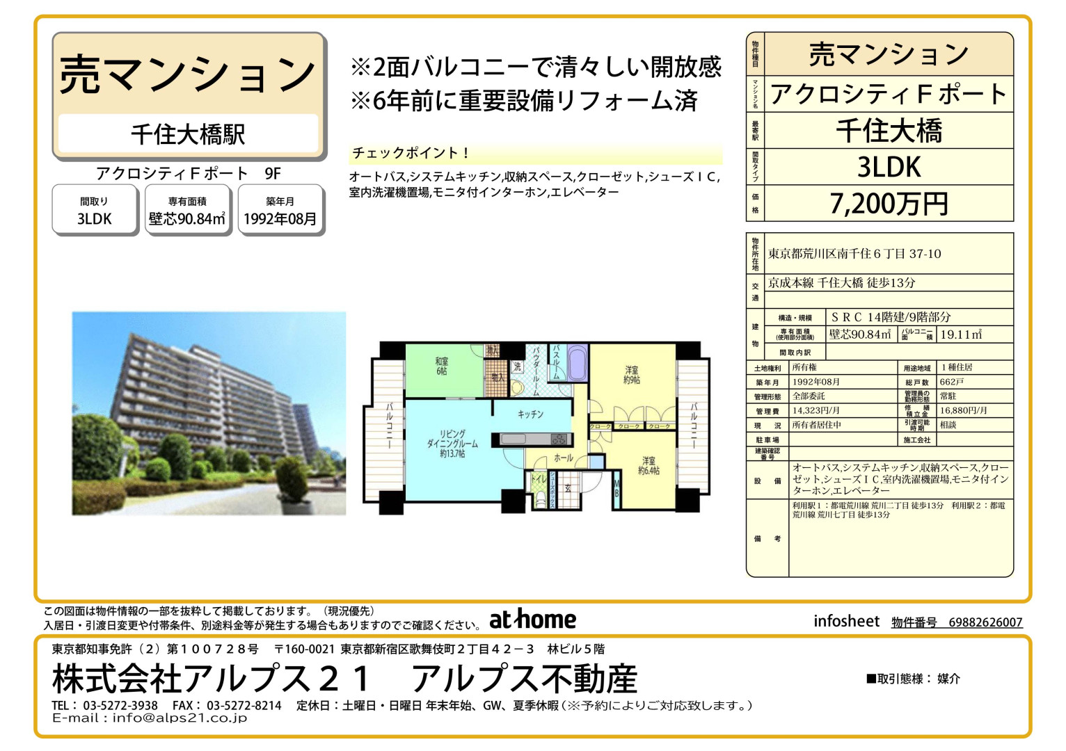 アクロシティFポート 9Fnew 7200万円 3LDK 90.84m² 物件の詳細を見る 価格 7200万円 中古マンション 間取3LDK 共益費・管理費14323円 所在地 東京都荒川区 南千住6丁⽬ 37-10 交通 京成本線千住大橋駅 徒歩13分 都電荒川線荒川二丁目駅 徒歩13分 築年月 1982/08 構造 面積 90.84m² 階数 地上 14階 物件番号