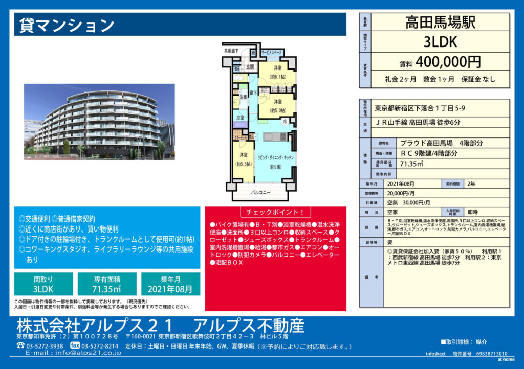 | 所在地 | 東京都新宿区下落合1丁⽬ 5-9 プラウド⾼⽥⾺場 |